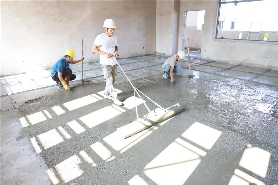 柳州市柳東新區(qū)明德中學(xué)項目,工人正在進(jìn)行4#綜合樓三層水磨石拌合料鋪設(shè)。
