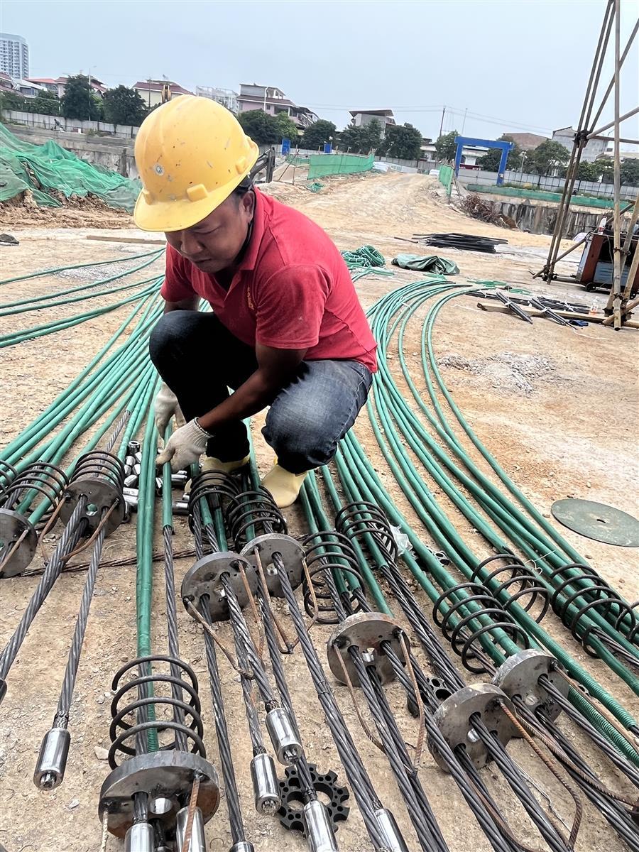 貴港市棚戶區(qū)改造(三期)白凹窩安置區(qū)項目B2標(biāo)段項目,工人正在進(jìn)行壓力型預(yù)應(yīng)力抗浮錨桿加工。