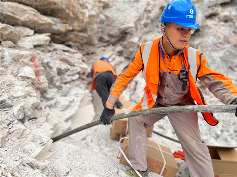 柳州市柳北區(qū)石碑坪古木村石灰?guī)r礦爆破工程,爆破作業(yè)人員正在進(jìn)行裝藥、網(wǎng)絡(luò)延時設(shè)置等作業(yè)。