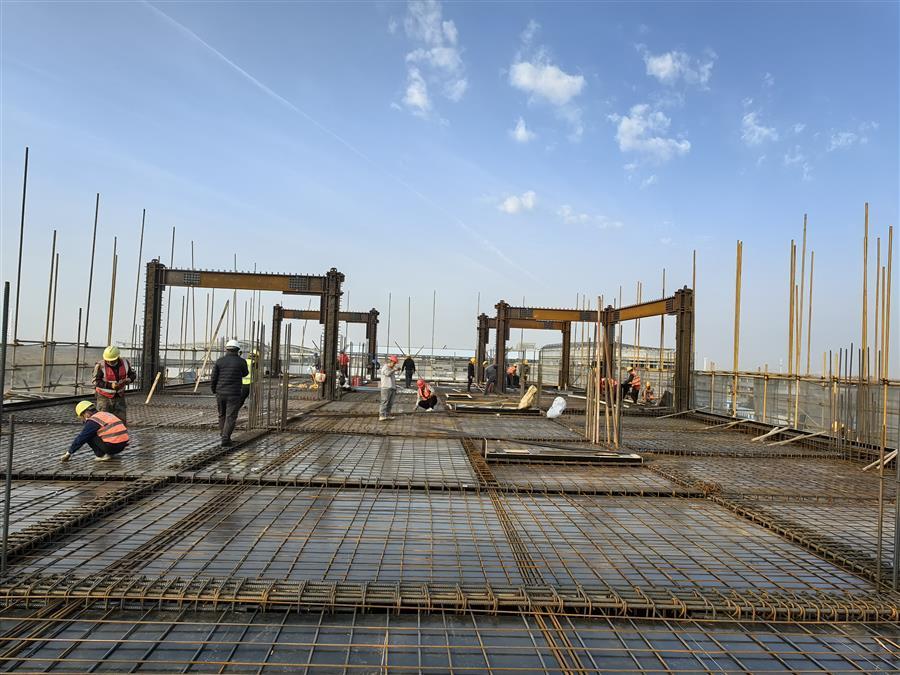 在施工現(xiàn)場,到處可見建筑工人們忙碌的身影,大家分工合作,井然有序地進行病房北樓梁板鋼筋綁扎、水電消防線管預(yù)埋、鋼結(jié)構(gòu)吊裝、醫(yī)技區(qū)東段盤扣架搭設(shè)、汽車坡道混凝土澆筑等工作面施工,各作業(yè)面協(xié)同推進,現(xiàn)場掀起“大干”熱潮。