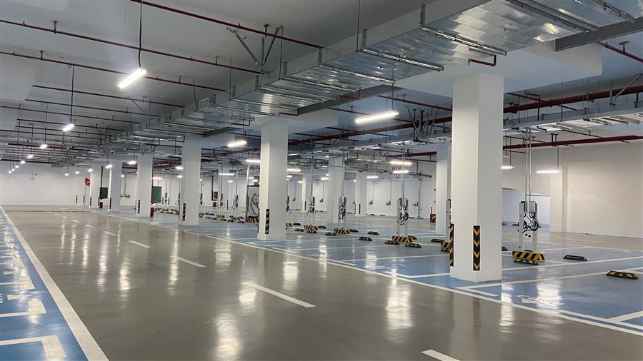 項目總建筑面積約2.7萬平方米,為一座兩層局部覆土式地上停車庫,建設內容包含停車場、地面廣場鋪裝及綠化、給排水、電氣、消防等附屬工程。項目建成將新增600個機動車位,其中負二層510個機動車位,負一層78個有充電樁的新能源停車位,屋面12個無障礙車位;另外,停車庫屋面設有283個非機動車位。綠地率為60%。停車場內部空間寬敞明亮,外觀看像是地下停車庫,但實際上由于該區(qū)域地勢較低,為合理規(guī)劃,特意將停車庫設計為地上兩層局部覆土式停車庫,即在停車庫上方回填泥土,在泥土上種植綠化樹木,將車庫上方裝點成一個小公園。項目交付運營,有效緩解三門江森林公園周邊“停車難”問題。