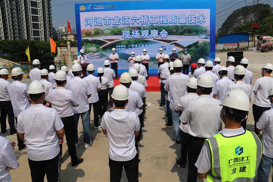 8月1日,冶建公司工程質(zhì)量技術(shù)現(xiàn)場觀摩會(huì)在桂金分公司施工的河池市龍江六橋(輝樂橋)工程項(xiàng)目舉行。公司總經(jīng)理、黨委副書記蒙勝益,副總經(jīng)理唐峰,副總經(jīng)理、安全總監(jiān)何勇參加。