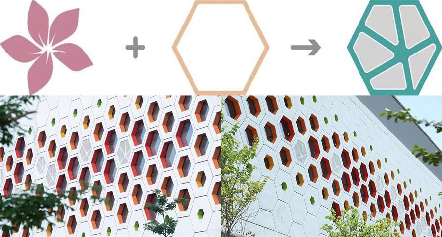 項(xiàng)目整體采用去工業(yè)化設(shè)計(jì),將紫荊花與蜂巢的意象同時(shí)融入建筑立面,形成“蜂棲紫荊”的寓意;其中紫荊花代表柳州,而蜂巢之中花粉釀蜜的過程,又與垃圾焚燒發(fā)電的工藝流程形成隱喻。