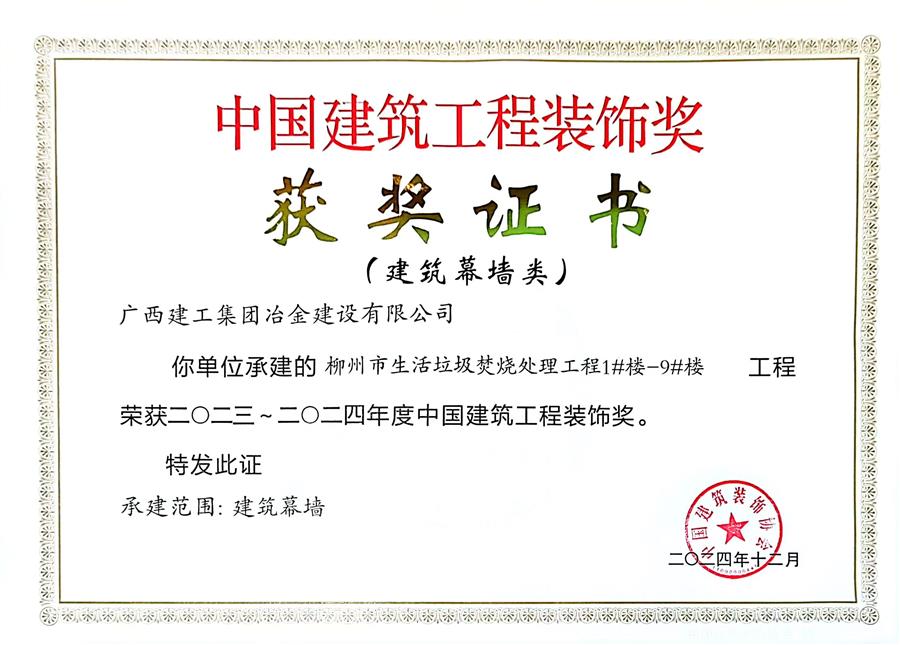 12月10日,中國建筑裝飾協(xié)會九屆四次理事會九屆六次常務(wù)理事會暨中國建筑裝飾協(xié)會成立40周年大會在北京召開,冶建公司承建的柳州市生活垃圾焚燒處理工程1#樓-9#樓獲2023—2024年度“中國建筑工程裝飾獎”。至此,冶建公司已經(jīng)七奪“中國建筑工程裝飾獎”。