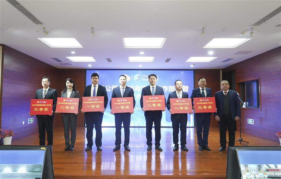 公司董事長、黨委書記覃振華(右三)上臺領(lǐng)取2024年隊(duì)伍建設(shè)工作專班獎,公司總經(jīng)理、黨委副書記蒙勝益(左一)上臺領(lǐng)取2024年管理費(fèi)用控制工作專班獎