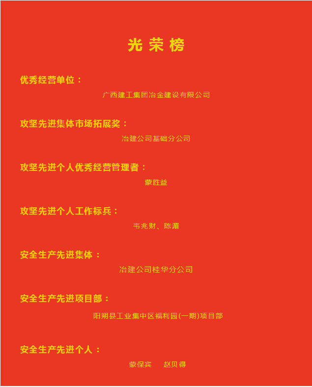 2 月 14 日,廣西建工集團(tuán)有限責(zé)任公司 2025 年專班工作部署暨重點(diǎn)工作推進(jìn)會、安全生產(chǎn)工作會、黨建工作會等系列會議在南寧召開。會議表彰了2024年度先進(jìn)集體和先進(jìn)個人,冶建公司榮獲多項(xiàng)集體和個人榮譽(yù)。