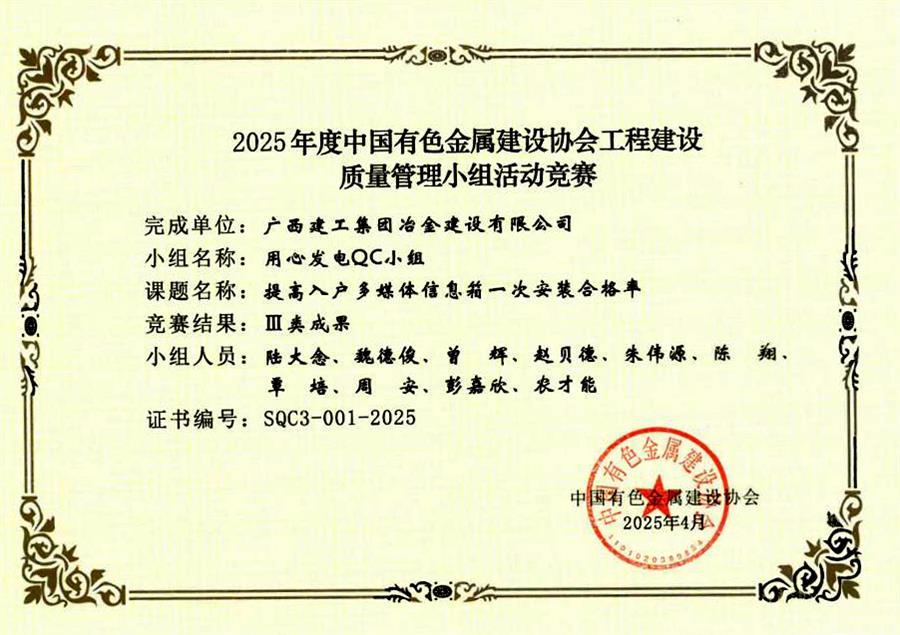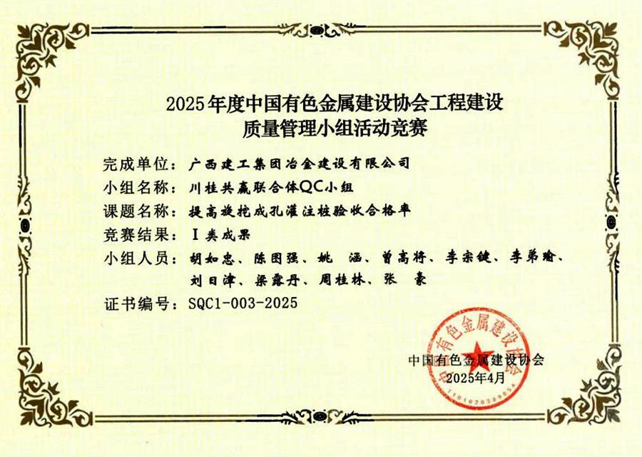 近日,中國有色金屬建設(shè)協(xié)會公布2025年度中國有色金屬協(xié)會工程建設(shè)質(zhì)量管理小組活動競賽結(jié)果,冶建公司申報的4項成果中,有三項獲得Ⅰ類成果,一項獲得Ⅲ類成果。公司此次申報獲獎率100%。
