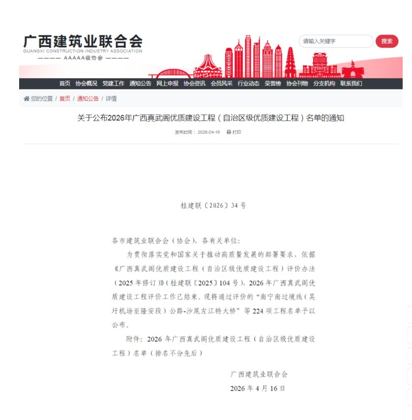 4月16日,廣西建筑業(yè)聯(lián)合會發(fā)布了《關(guān)于公布2026年廣西真武閣優(yōu)質(zhì)建設(shè)工程名單的通知》,冶建公司有9項(xiàng)工程獲此殊榮。