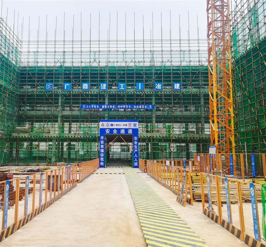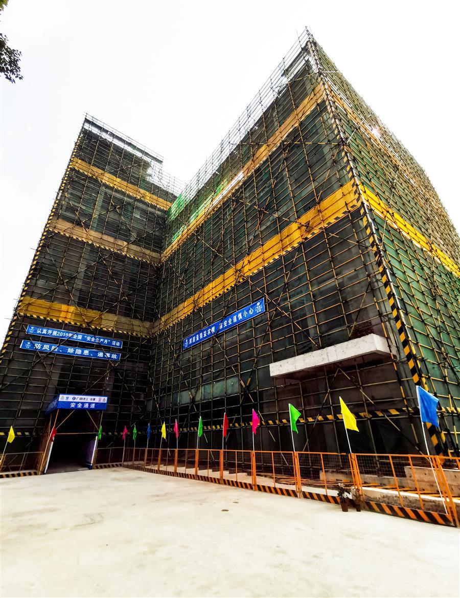 該項(xiàng)目由桂金分公司承建,總建筑面積14993.85平方米,包括1棟9層40.35米高的業(yè)務(wù)綜合樓和1層10.8米高的報告廳,以及大門、圍墻、供配電、給排水、道路及地面硬化、擋土墻、綠化、醫(yī)療氣體系統(tǒng)等附屬設(shè)施及電梯等設(shè)備購置。目前,項(xiàng)目已完成整體地下室及主樓1~5主體框架結(jié)構(gòu)施工,目前正在進(jìn)行主樓6層內(nèi)架搭設(shè)。